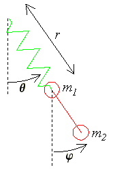 | r'' = | 1 | ( k (2 m1 + m2) (h − r) + 2 m1 (m1 + m2) r θ'2 + 2 g m1 (m1 + m2) cos θ + 2 S m1 m2 φ' 2 cos (θ − φ) − k m2 (h − r) cos(2θ − 2φ) ) | |